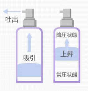 エアレス容器は、ポンプを押すとボトル底部が上昇して内容液が押し上げられます。中身が外部空気に触れることがないので、雑菌や汚染を防ぎ、最後まで衛生的に使えます。